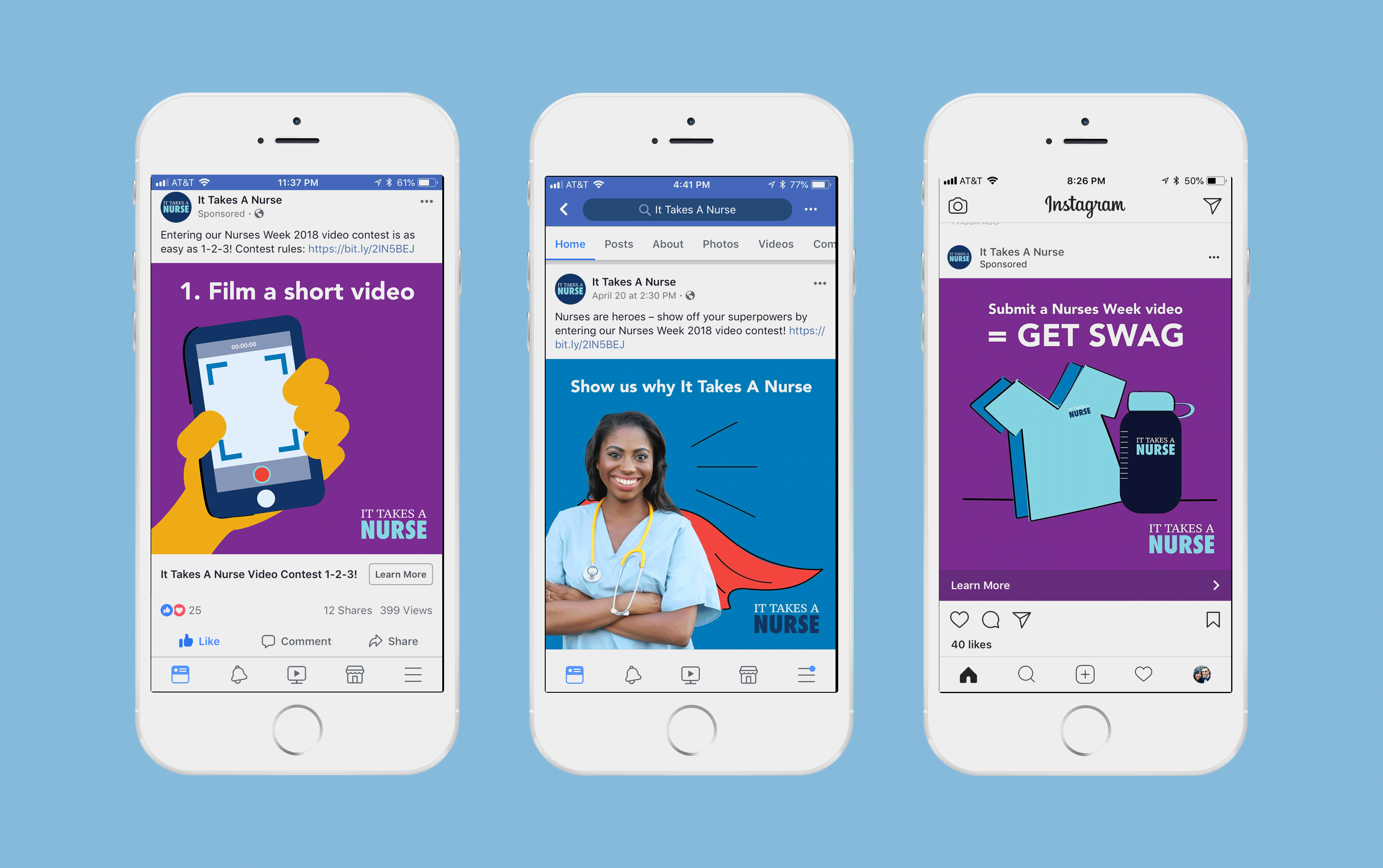 Created the visual identity for the “It Takes a Nurse” Facebook page, including monthly assets and quarterly ads to grow the community to over 50K followers.
